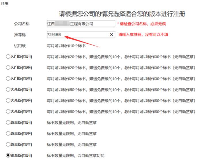 1)假设您的朋友在注册时,填写了您企业的推荐码(如下图所示),从入门版到签章版,不论他注册的是哪个版本,您均可成功获得1积分。之后您也可以通过上述“查询积分明细”窗口查询到具体是什么时间、哪家企业进行注册,让您成功赚取到了积分。